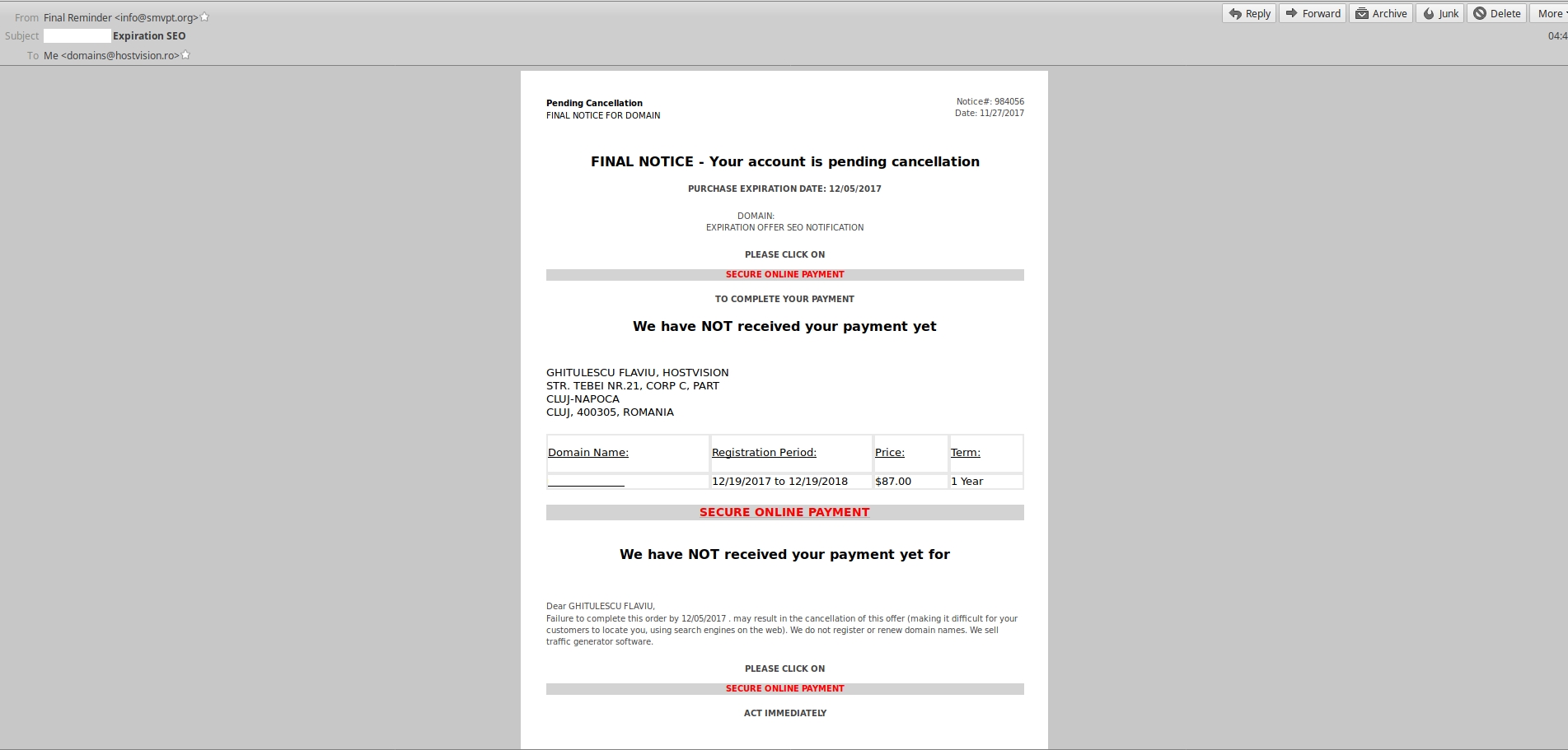 In generela email-urile asemanatoare vor fi trimise de catre furnizorul dumneavoastra de servicii de SEO sau de catre registrar-ul domeniului, insa niciodata sub forma prezenta in print screen-ul de mai sus.