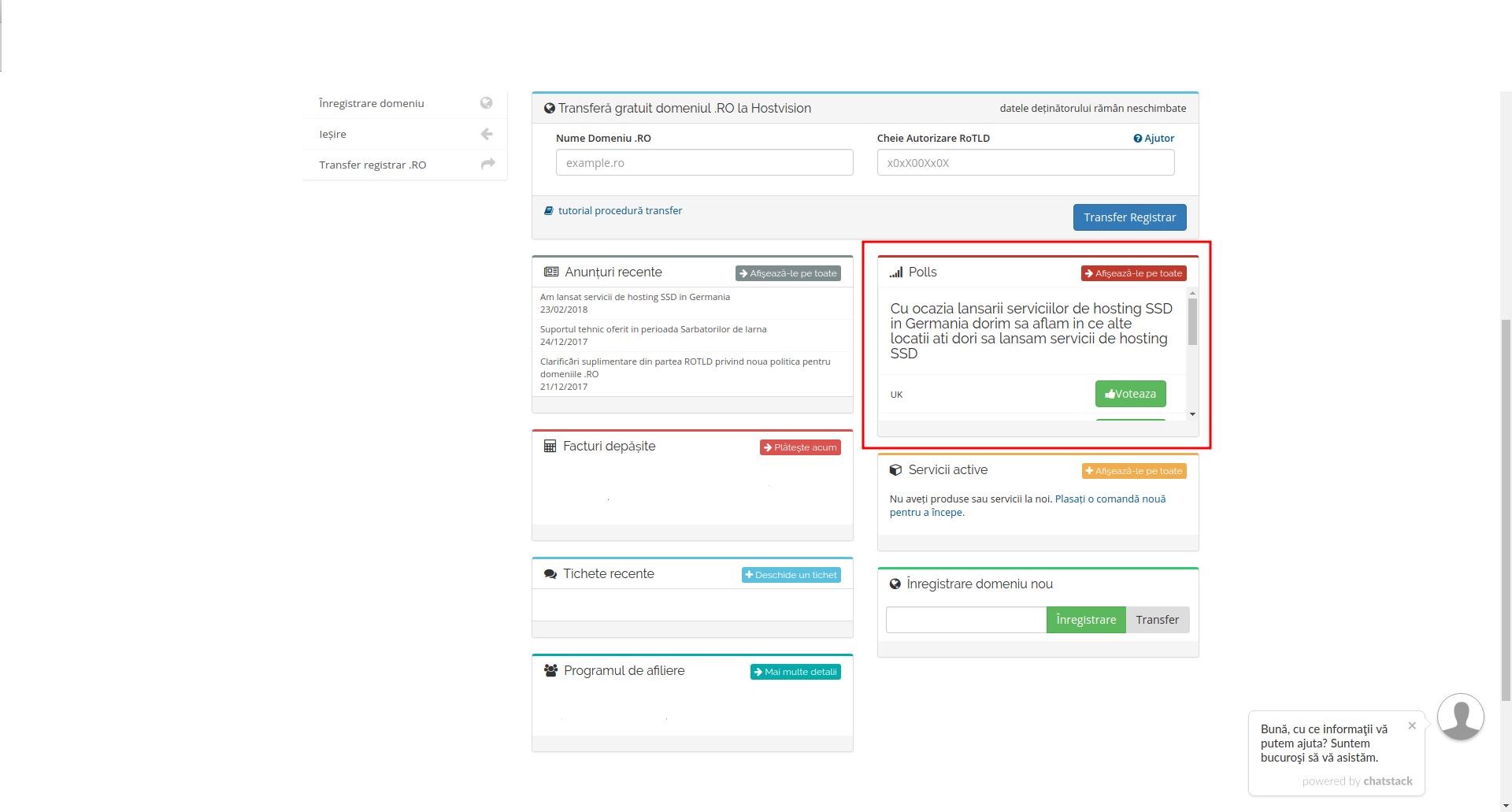 HostVision este compania care pune pe primul loc clientii sai si lucreaza in permanenta la imbunatatirea relatiei cu acestia, drept urmare feedbackul primit este foarte important. Din acest considerent am implementat un Poll pentru a va permite sa va exprimati parerea cu privire la serviciile oferite. Poll-ul are rolul de a vota viitoare functionalitati/servicii Hostvision. In urma voturilor, echipa Hostvision va evalua rezultatele poll-urilor respective si va veni cu o metoda de implementare a sugestiilor clientilor.